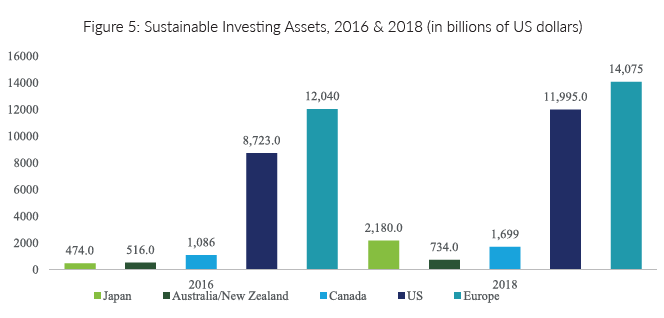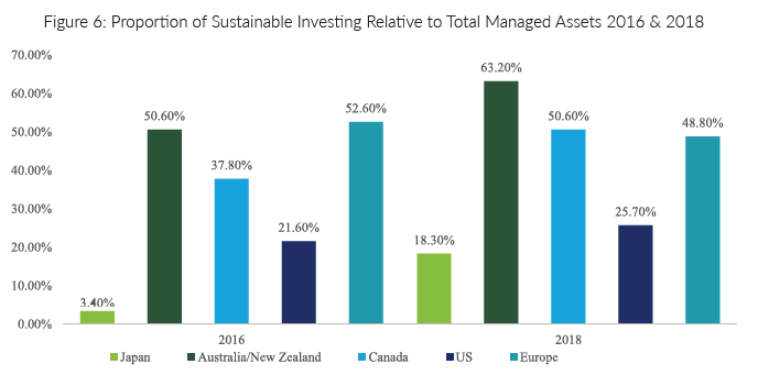 However, the scope of sustainable form of finance is not limited to banking only. It has been incorporated in the investment strategies as well. The figures 5 and 6 shows the global sustainable investment universe and its distribution across five countries/regions. As we notice, most of these assets are in the developed region and