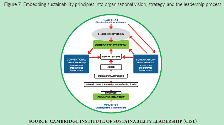 The below diagram (figure 7) depicts the proposed model of the Cambridge Institute of Sustainability Leadership (CISL) as to how the senior leadership can embed sustainability agenda into the long-term vision of an organisation.