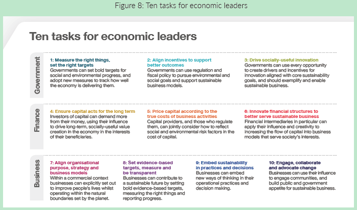 In the above figure, CISL segregates the whole sustainability ecosystem into three key segments: Government, Finance & Business. In each segment, it outlines the key tasks that need to be undertaken.